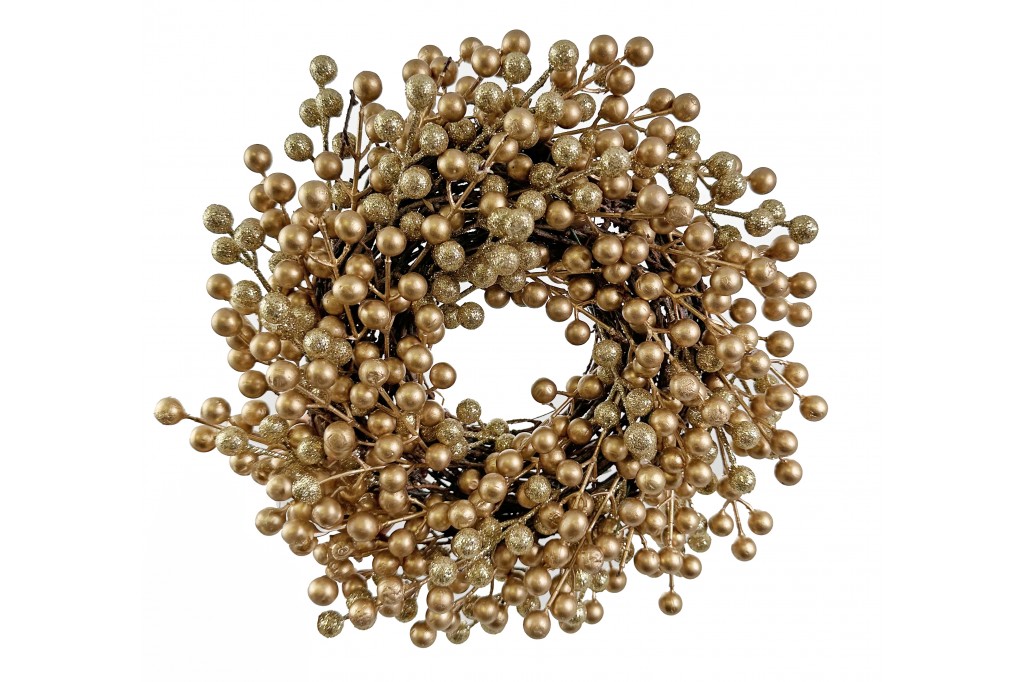 Krásný věnec se zlatými a třpytivými bobulemi.