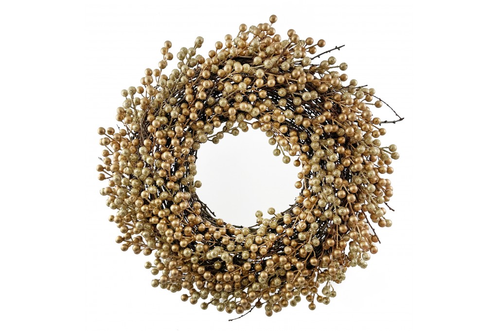 Krásný věnec se zlatými a třpytivými bobulemi.