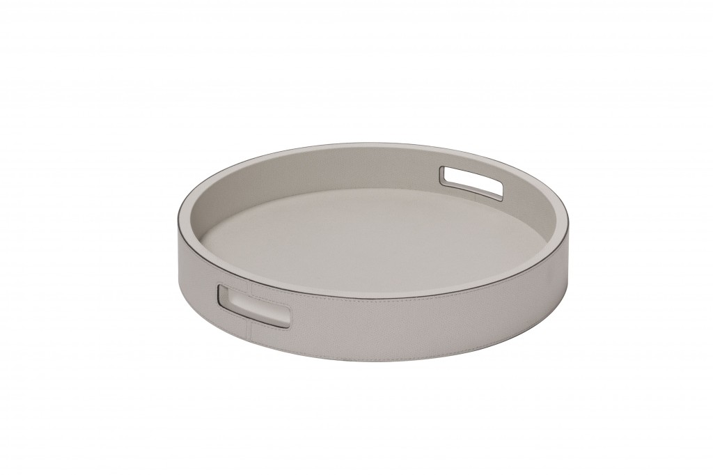 The round serving tray from the Polo collection by GioBagnara is crafted from a sturdy structure covered in premium leather in a mocha shade. It features elegant handles, a subtly raised rim and a practical surface that is easy to maintain.
