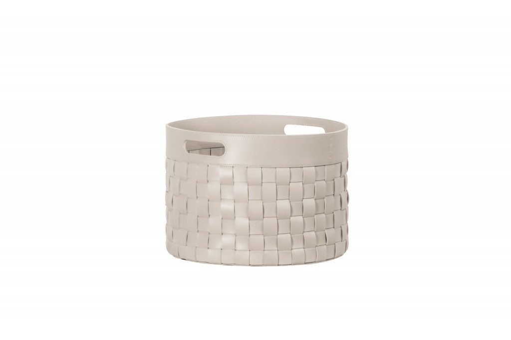 A water-resistant storage basket made of woven saddle leather with handles.